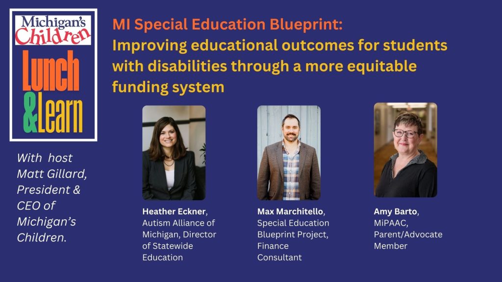 Matt Gillard, President & CEO of Michigan’s Children, and panelists for a lively discussion on the MI Special Education Blueprint. Please listen to this conversation among experts on how we can improve educational outcomes for students with disabilities through a more equitable funding system.